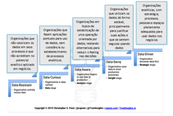 Christopher S. Penn, autoridade em tecnologia e marketing e autor do best-seller Marketing White Belt: Basics for the Digital Marketer, no seu artigo The evolution of the data-driven company, diz que ser uma empresa orientada por dados significa adotar uma abordagem em que os dados desempenham um papel central em suas operações e tomadas de decisão.
